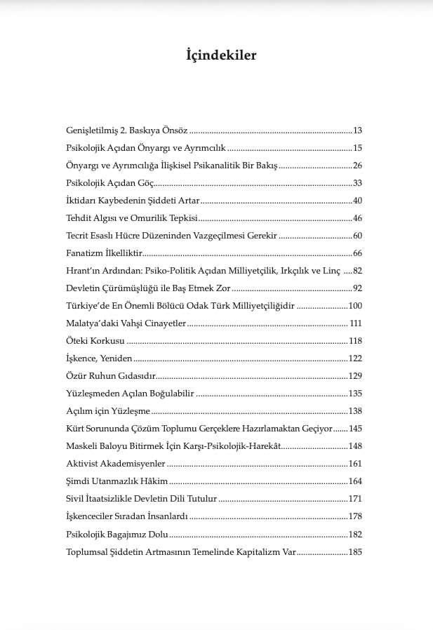 Bu kronolojik sıranın iki istisnası en baştaki ve en sondaki ikişer makale. Bilimsel makale formatında daha önce üçü başka kitaplarda ve biri de bir bilimsel dergide yayınlanmış bu yazıları da buraya alarak, aradaki 71 parçada dillendirdiğim dertlerin teorik (ve ampirik) arkaplanlarına dair bir parantez kurmak istedim. İlk iki makalede önyargı ve ayrımcılığı psikanaliz ve sosyal psikolojiden faydalanarak psiko-politik açıdan ele alıyorum. Son makalede ise bu sefer yüzleşme diye adlandırılan sürecin psiko-politik arkaplanına eğiliyorum. Sondan bir önceki bilimsel makalede ise birçoğuna benim de katkıda bulunduğum, Türkiye’de İşkence Mağdurlarının Psikolojisi Üzerine Yapılmış Bilimsel Çalışmalar sergileniyor ve tartışılıyor.